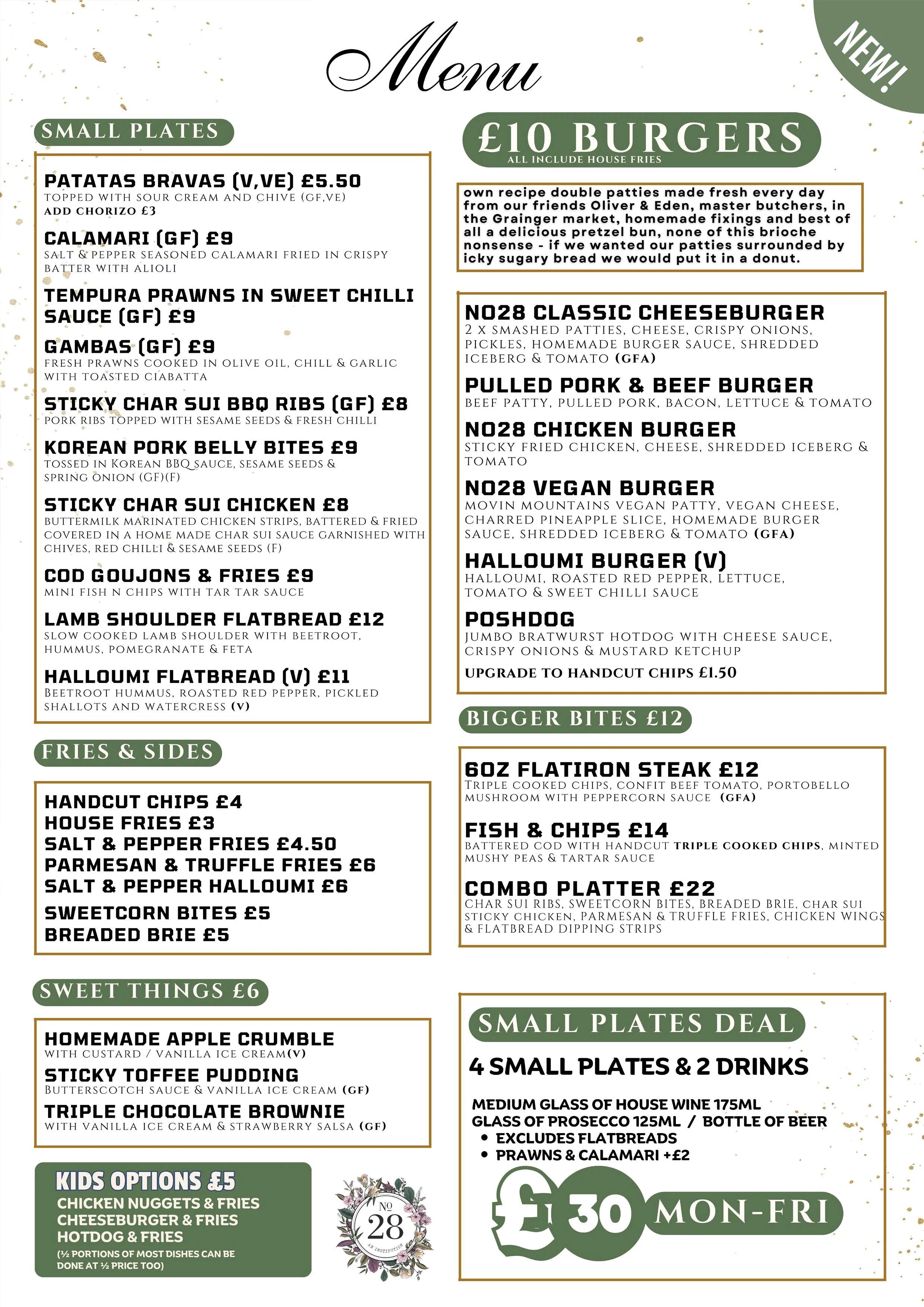 Our legendary £10 burgers are made with fresh double patties from trusted local butchers, served in a soft pretzel bun and always include fries. Choose from classics like the cheeseburger, chicken or pulled pork & beef, go meat-free with our vegan or halloumi burger, or ask about our rotating NO28 Spectator special. Not in the mood for a burger? The Poshdog is a firm favourite.